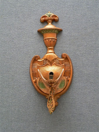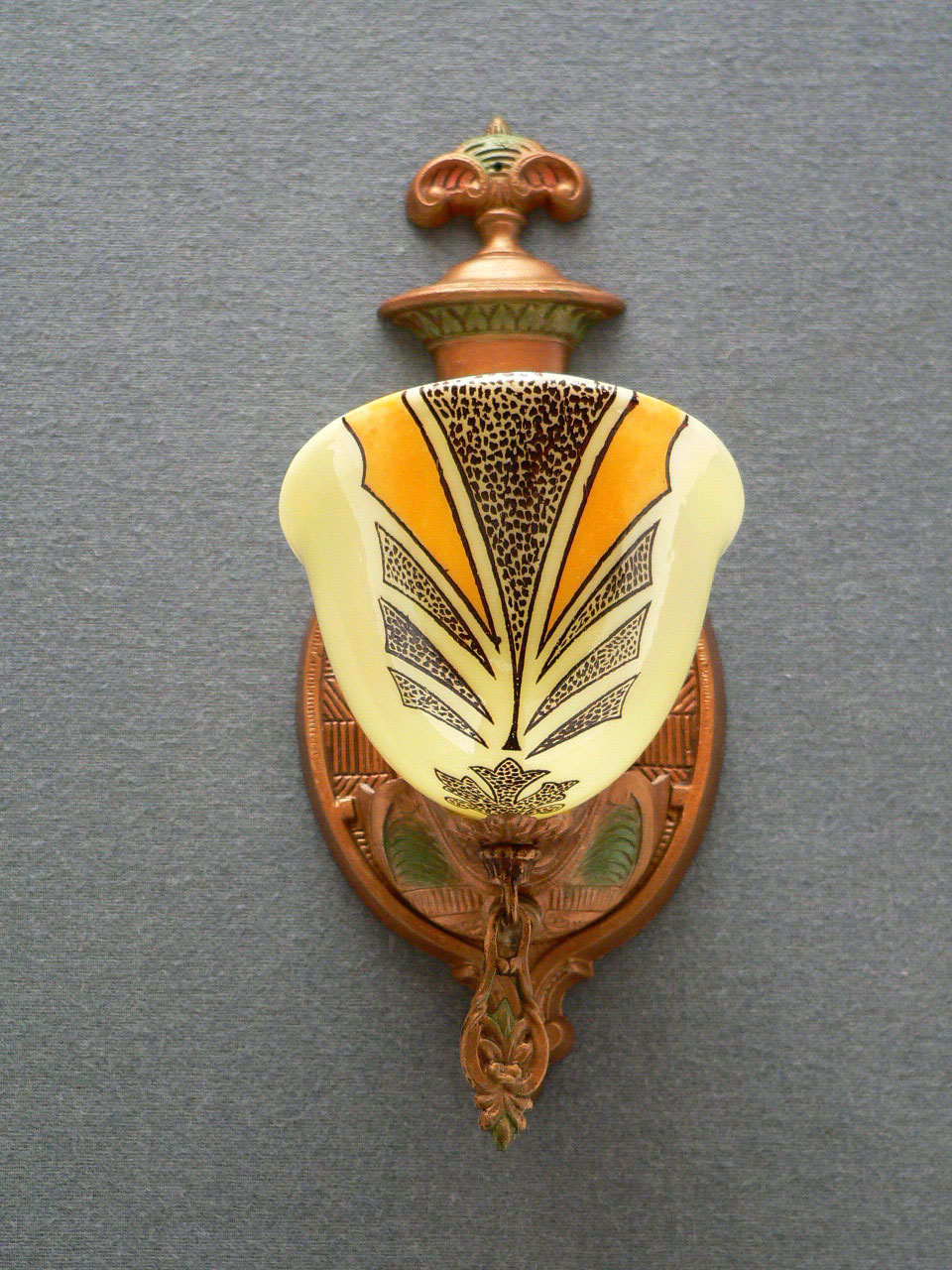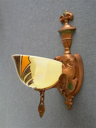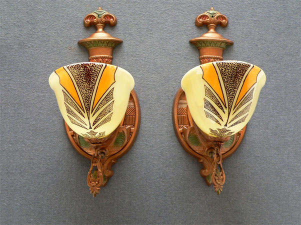 Sconce S98This rare pair of authentic Art Deco sconces was made in the 1930s by the Gill Glass Company. The cream colored slip shades have painted designs with deep yellow accents. The backplates have been carefully cleaned to show their original polychrome finish. Both the back plates and shades are in excellent condition. H: 12" |